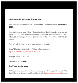 Recent DiscussionsLatest Phishing News 06/10/2025 We’ve been made aware of phishing emails circulating that contain the content shown below. Please note that these emails were NOT sent by Virgin Media O2 and should NOT be responded to. Do not click ...Hacked Account - Blueyonder Email Address We have a hacked secondary Blueyonder email account which we cannot access as the third party email address has been changed to one we do not have access to and this account is now being used to chan...Parental controls not working Good day, I have an issue with parental controls not working, I have tried pretty much everything I can think of as in the following Toggled the settings off and on again Reboot all devices and ...Is this number a genuine VM contact Hi, I received the following text from an unknown sender, Reminder ! Your technician visit is due tomorrow, PM slot. Please reply YES to confirm the appointment. Please contact our office on (01) 44...Linking Virginmedia to O2 accounts I have had an interesting hour and a half discussion with Virgin Complaints team. As you know they now have a Virgin/O2 website linking your Virgin account with your O2 account. However, there is an...Latest Phishing News 01/10/2025 Latest Phishing News 01/10/2025 We’ve been made aware of phishing emails circulating that contain the content shown below. Please note that these emails were NOT sent by Virgin Media O2 and should ...well well well check this out.... Essential Security built into your home network, at no extra cost then... If you want an enhanced antivirus offering, you can also choose to take our Advanced Security, whi...My Virginmedia IP address is being blocked by Spamhaus? Both my iphone and ipad and my wifes and daughters iphones now will not access the ios mail app to collect mail. Virgin say it is not there problem and i have discovered the main ip is blocked by sp...Constant Calls I have been having constant calls from people claiming that they are from marketing. The number is +44 800 052 1251. I get these calls every single day and they are usually around the same time each ...Latest Phishing News 22/09/2025 Latest Phishing News 22/09/2025 We’ve been made aware of phishing emails circulating that contain the content shown below. Please note that these emails were NOT sent by Virgin Media O2 and should ...