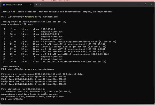 As far as I can tell all other internet traffic seems OK (well nothing else that I regularly use has a problem).  Here is the trace route results.  Perhaps someone can use this info to fix the fault, I totally rely on Rustdesk to access all my computers in my home.