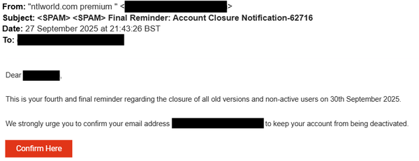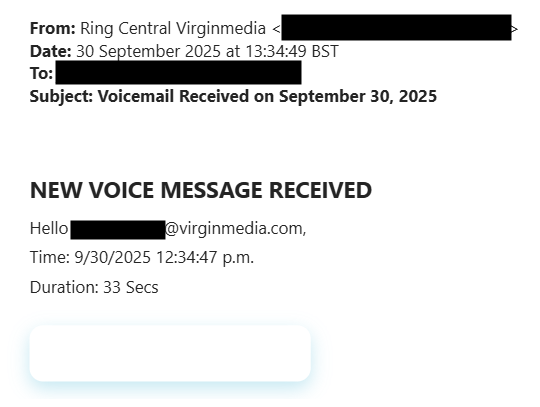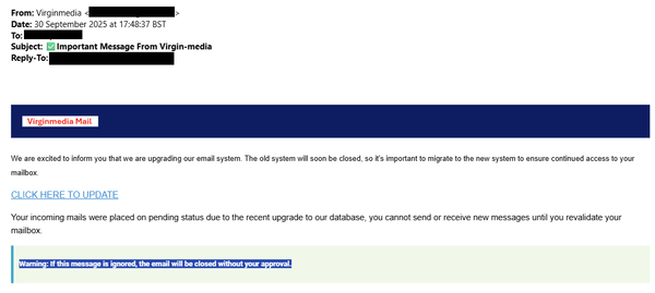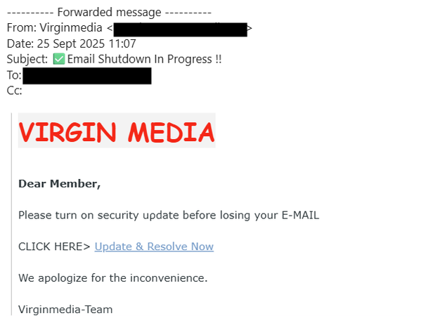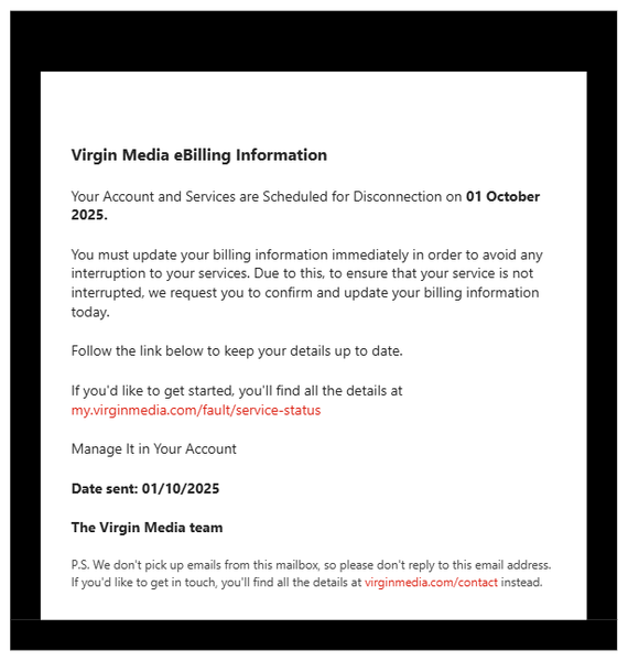 We’ve been made aware of phishing emails circulating that contain the content shown below. Please note that these emails were NOT sent by Virgin Media O2 and should NOT be responded to. Do not click on any links or reply to these messages. Instead, we recommend deleting them immediately. If you'd like to report the email, you can forward it to our dedicated phishing inbox at phishing@virginmediao2.co.uk.