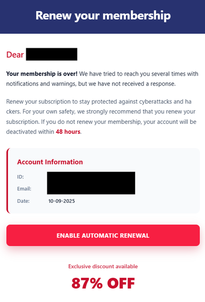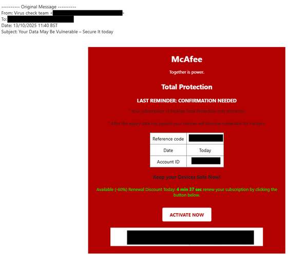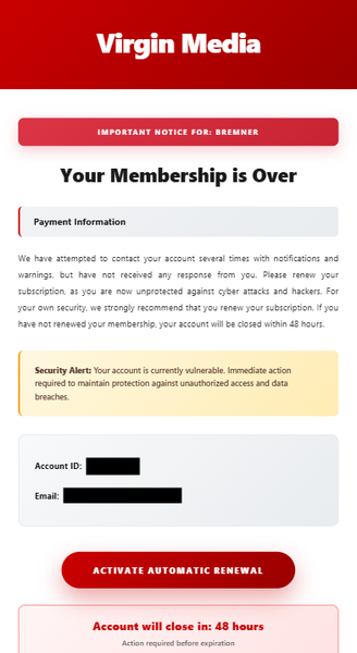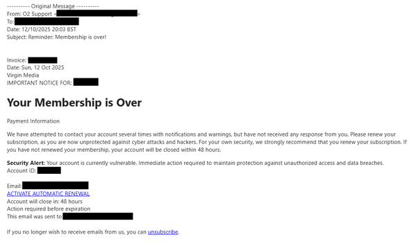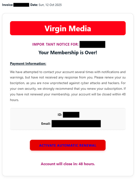 We’ve been made aware of phishing emails circulating that contain the content shown below. Please note that these emails were NOT sent by Virgin Media O2 and should NOT be responded to. Do not click on any links or reply to these messages. Instead, we recommend deleting them immediately. If you'd like to report the email, you can forward it to our dedicated phishing inbox at phishing@virginmediao2.co.uk.