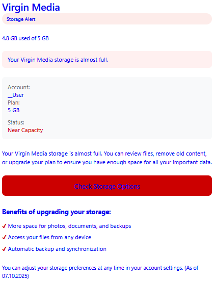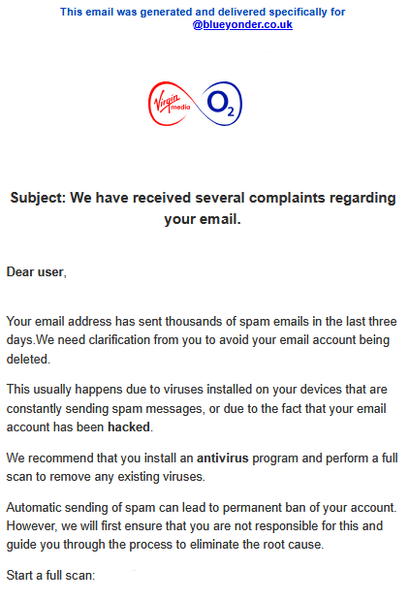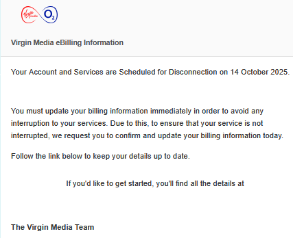We’ve been made aware of phishing emails circulating that contain the content shown below. Please note that these emails were NOT sent by Virgin Media O2 and should NOT be responded to. Do not click on any links or reply to these messages. Instead, we recommend deleting them immediately. If you'd like to report the email, you can forward it to our dedicated phishing inbox at phishing@virginmediao2.co.uk.