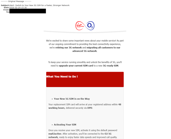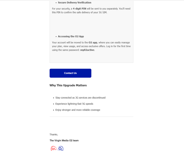 We’ve been made aware of phishing emails circulating that contain the content shown below. Please note that these emails were NOT sent by Virgin Media O2 and should NOT be responded to. Do not click on any links or reply to these messages. Instead, we recommend deleting them immediately. If you'd like to report the email, you can forward it to our dedicated phishing inbox at phishing@virginmediao2.co.uk.