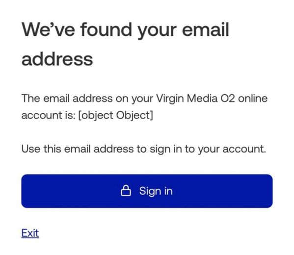 It repeatedly says “we’ve found your account email, object object” and then goes off.