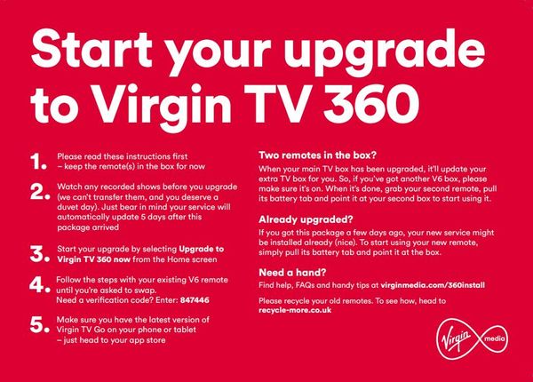 A TiVo-box (easily confused with TiVo-software) is physically swapped out for a TV360 box, but a V6 isn't - you receive the remote, you have a short time to instigate the software conversion yourself before it's done for you. The box is reformatted to remove TiVo-firmware, Horizon is reinstalled in its place, and the same box begins a new life as TV360.