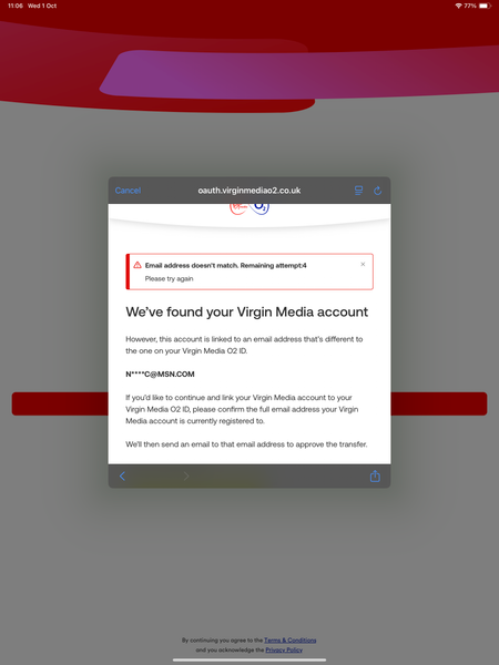 Hi, I was trying to link my virgin media account and create Virgin media O2 account, unfortunately it has an old email address registered to my virgin media account that I no longer have access to, step-son stupidly deleted it on Microsoft account and I lost it forever, thus when I try to use my new email it wants to send a email to my old email address first so I can change to the new email address, because of this it now just sends me around in circles now and I can’t even sign in to just my virgin media account anymore as it send me to the screen below, I now have no access to anything, I do recieve emails from virgin media to my new email account but as for logging in I’m stuck, any way I can get access without having to get an email sent to my old email address