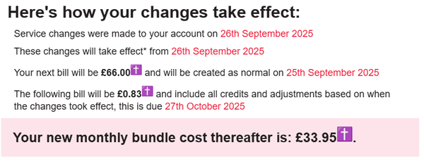 I had a notification at the end of August telling me that my contract was expiring and informing my prices would increase. I then went through the process of choosing a new contract, signing it and getting all the confirmation & contract details through saying that my next payment would be £66 and then after that it would be £0.83, then every month thereafter it would be £33.95. So you can imagine my surprise when I open my emails telling me my next bill would be £70!!