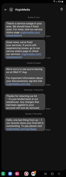 Hi, I received sms text by Virgin media on 17th November 2025 saying that I own money and should use quickpay link to pay my final bill. My cancellation date was approved by text sms on 26 August 2025 and returned kit was accepted on 10 September 2025 by sms text from Virgin media as well.