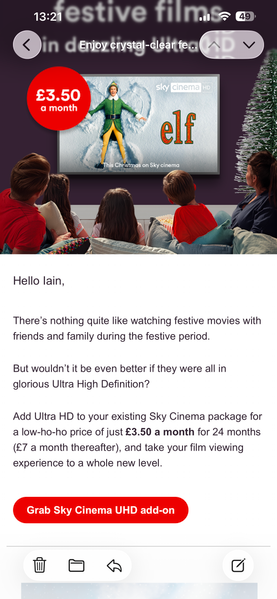 The Ultra UHD for £7 per month normally includes both Sky Sports and the Sky Cinema and Entertainment UHD content [assuming you can get the latter which I assume you can having got the email]. It would be odd to offer a half price deal but for only [at best] half of the content. Make sure you don't accidentally sign up until you are sure though.