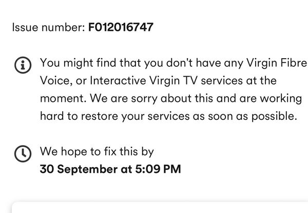 • ➡ Description: You might find that your Virgin Fibre, Voice and Virgin TV services are intermittent, with the picture freezing or disappearing now and then. We are sorry and our engineers are working hard to resolve this for you.