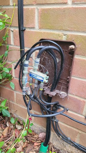 The omni box at my property is damaged and the main cover completely missing. Additionally, one of the cables (the middle cable going to the 3-way splitter) has a split in it - see picture, attached.