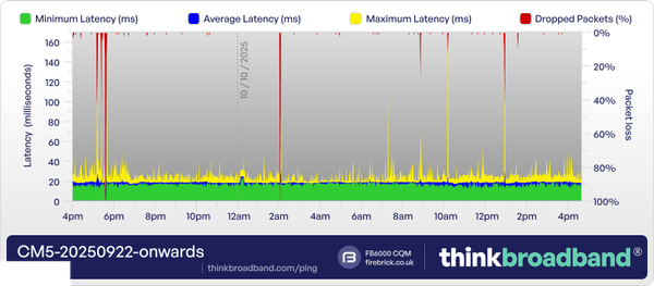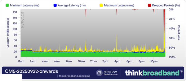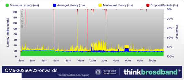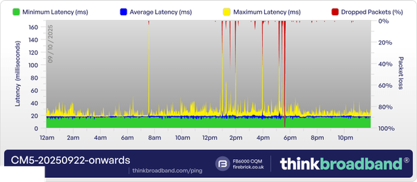 22/09/2025 Evidently motivated to re-visit ThinkBroadband BQM to see what was occurring (I didn't note any levels at this point). Noticed the CM IP change and thus set up a new BQM to monitor from this point.
