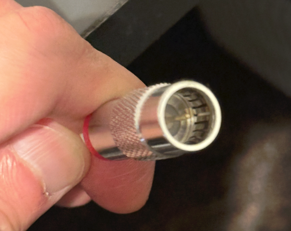 The cable trailing from the wall is screw fit. The cable in your hand is push fit.