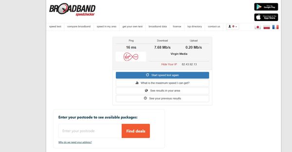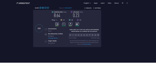However this morning it dropped to around 8mbps. I do a couple of speedtests to confirm (see pics). I also have the virginmedia app and i ran the speedtest on that ...and very strangely enough it ran at the same high speed as if there was no problems (ie 132mbps). I tested at least 3 different speedtests and all were around 7 or 8 mbps except for the Virginmedia one which was producing odd results.