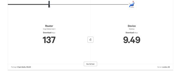 However, this morning it dropped to around 8mbps. I do a couple of speed tests to confirm (see pics). I also have the virgin media app and i ran the speed test on that ...and very strangely enough it ran at the same high speed as if there were no problems (ie 132mbps). I tested at least 3 different speed tests, and all were around 7 or 8mbps except for the Virgin media one which was producing odd results.