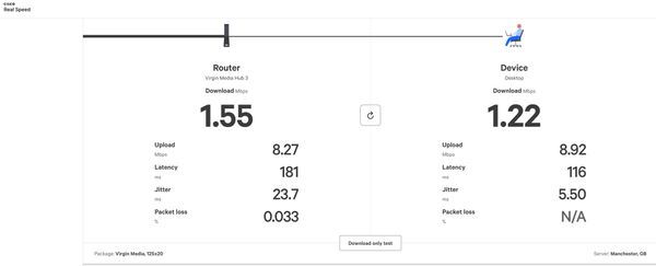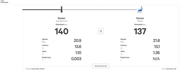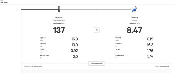 However, this morning it dropped to around 8mbps. I do a couple of speed tests to confirm (see pics). I also have the virgin media app and i ran the speed test on that ...and very strangely enough it ran at the same high speed as if there were no problems (ie 132mbps). I tested at least 3 different speed tests, and all were around 7 or 8mbps except for the Virgin media one which was producing odd results.