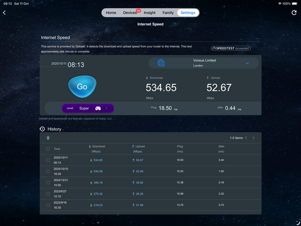 Logging into the router and running the in built speed test it says it is getting 500mb however, the devices connected to this only get around 200mb. Hard wired via Ethernet seems to be getting 500mb so I’m sure the router is the issue.