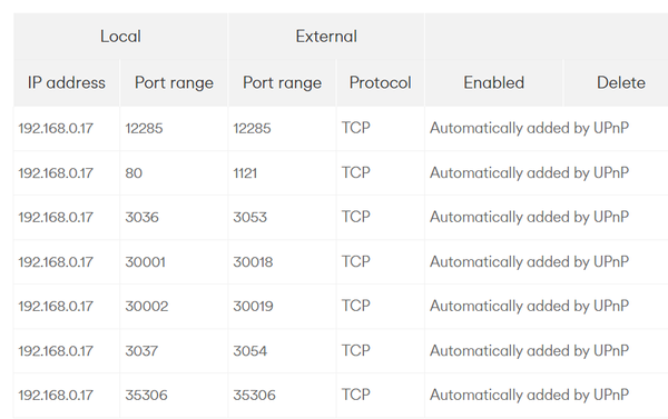 Port forwarding is also on these ports for that IP, which it has added by itself. I believe this is so that the CCTV box can talk to the external world via my router so that I should be able to access it via mobile data. The ports are a bit randomly added below but the main ones to my CCTV look covered.