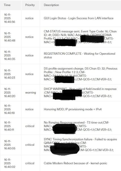 My modem log shows repeated kernel-panic reboots, SYNC Timing Synchronization failures, and T3 timeouts, all indicating a clear problem with upstream/downstream signal quality on the line or at the node. The modem frequently loses its DOCSIS 3.1 lock and falls back to DOCSIS 3.0, which also explains the reduced speeds.