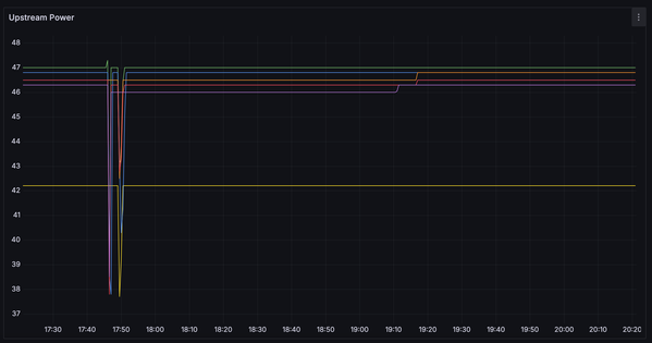 The connection re-established itself after a few minutes, but the ThinkBroadband BQM shows clear packet loss and latency spikes during that same window. My logs also recorded a sharp dip in upstream power across all channels, which then gradually recovered.