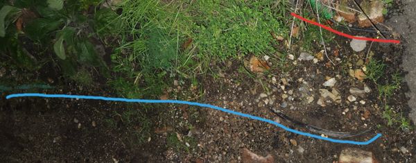 I noticed a while ago that the virgin drop cable apepars to have a stretch of about 1/2 to 1m the is not in any conduit infront of my house (still on my property). I think the cable is getting damaged. The red line is by the cable that goes from the pavement to my neighbour and the blue line is where I believe my cable runs. The cables have been exposed like this for years, but I'm only now seeing really bad issues.