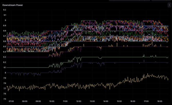 - Rising downstream power pushing channels closer to the top of acceptable range could be reducing error margin, leading to increased FEC activity and latency?