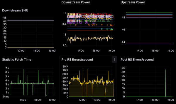 Grafana modem stats (downstream power + Pre-RS errors)
