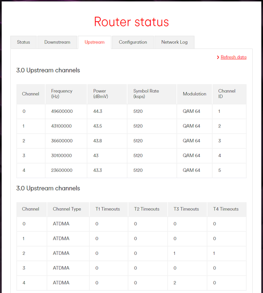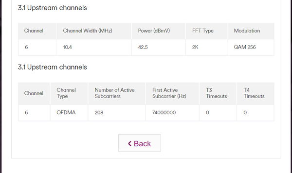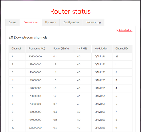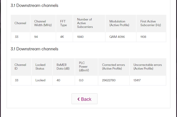 The stats show a lot of errors on both the 3.0 and 3.1 downstream channels. A few of the 3.0 downstream channels seem to show some noise ingress. Check that all cables and connections are in good order and switch the hub off and on again to reset the error counts and monitor. If the issues continue call them in as a fault.