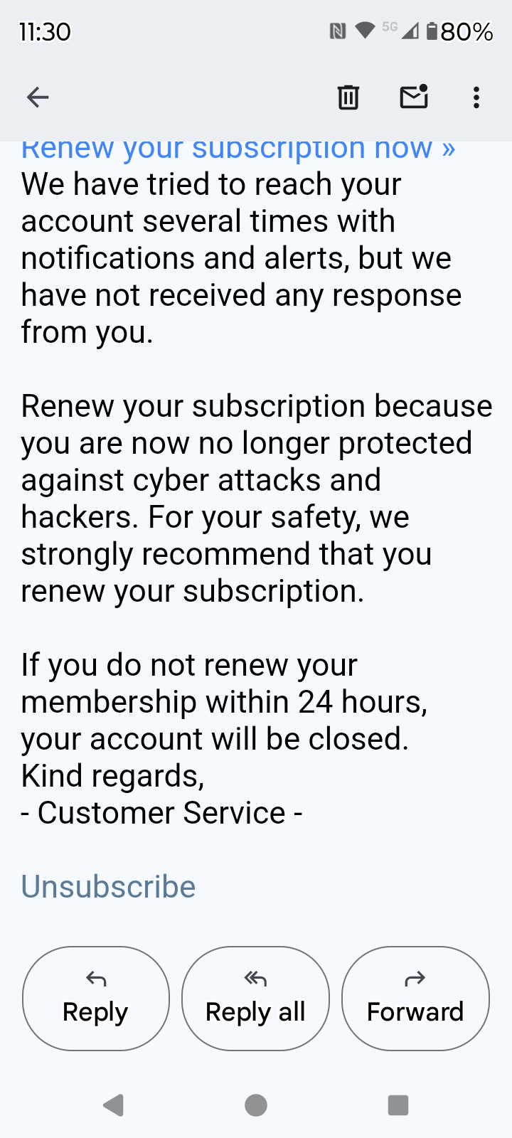 I've been getting emails supposedly from virgin media saying they are going to cancel my subscription (a word not used I'm my virgin contract) anyone else getting these? I've deleted them & reported spam. Next time I get one I'll post here
