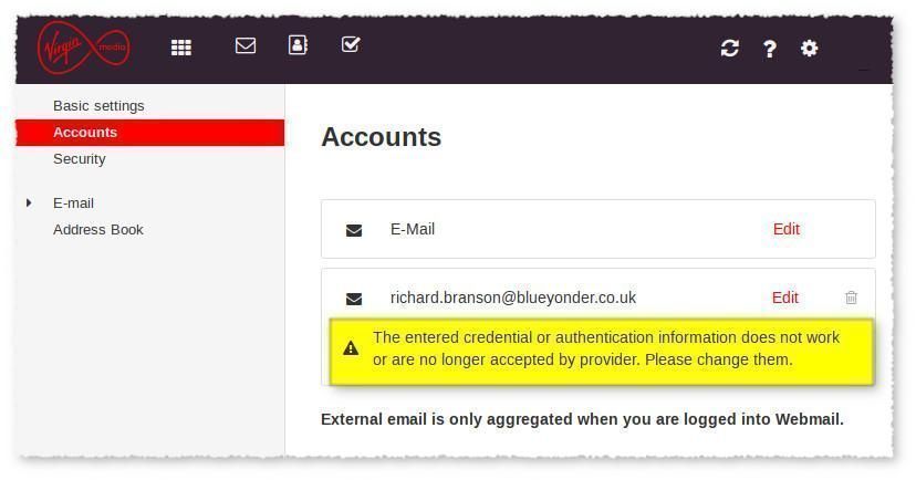 says "the enteted credential or authentication information does not work or are no longer accepted by provider. Please change them." This email been set up by virginmedia support team so I don't have any information about details on set up! And support no longer exists with virgin media. No way to contact support. Just keep searching for Internet but no avail!!! Me screen info is as follows:-