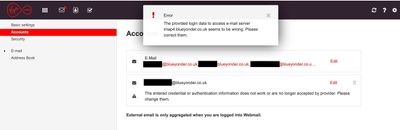 I have run into major problems with my email accounts. On 25/06/24 I stopped being able to send and receive emails from one of my accounts. On logging into Virgin Media emails account online I can see that, my secondary email account is empty and has ! next to it. See screenshot 1 below. When I click on the ! I see the information in screenshot 2. I have tried to find a solution to reading information on this forum but I am unsure what is the correct procedure and concerned that I may lose all my emails if I change information.