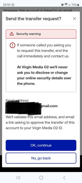 Now when I sign in with my Gmail I get in but when I go to manage my products it says add my virgin account when I put account number in I get approve the transfer of account to virgin media 02 id