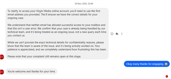 We must reiterate that there are no direct issues with email, if this is related to the single sign-in issue then this is fixable by logging into your My Virgin Media account with a third-party email address, and see if you can access your virgin.net email through there.