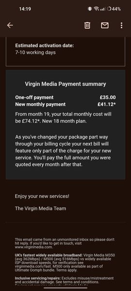 Our contract is up on the 30th December. We signed up and the intial 18 month deal is coming to an end. On the 27th November we logged into our account on the Virgin Media website and checked out the "upgrade deals for you". We saw one for 1gig broadband for £41.12 per month, just over £5 a month more than what we are currently paying. We went through the order and received pre contract documents and we told to receive a new hub and the new contract would start within 7-10 days. We've not heard a single thing since. There's no orders on our account and a few days ago I contacted the live chat team and over the course of TWO HOURS was told it can take up to 15 days for orders to be processed. A couple of days ago we received a bill for nearly £68, as our initial contract would be carrying on. TOTALLY UNACCEPTABLE AS WE HAD ALREADY SIGNED UP TO UPGRADE! Today I have got back onto the live chat and been called 'Richard' which shows that my messages aren't being read, my problem is t being dealt with and to add even more insult have been told that the best deal we can get is £51 a month. When the one we signed up for was £41.12. ABSOLUTELY UNACCEPTABLE!Solved2.2KViews0likes12CommentsVM are SNAKES!