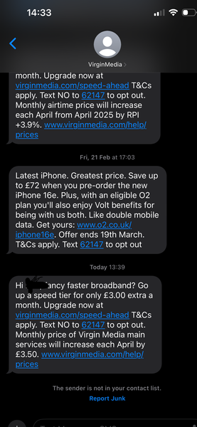 I got a text to my phone offering me an upgrade to the next speed tier for £3 Couldn't seem to do it on the phone, so spent 40 mins on live chat for the person to tell me its not available to me and it would cost me £106 to upgrade. Has anyone else received this? Is this a valid Virgin text, if so why am I getting it?193Views0likes5Comments