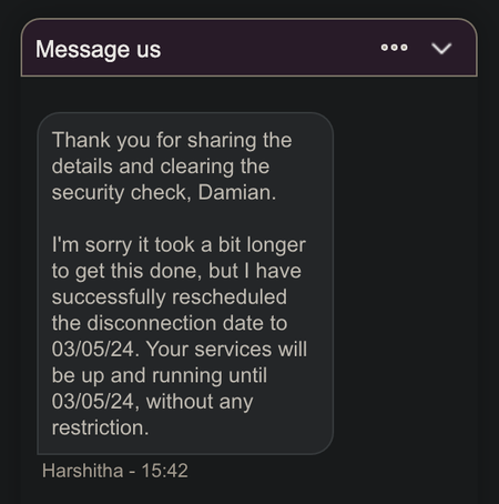 Hi. Hoping someone can help or steer me in the right direction - as ive been going around in circles and being passed to multiple people on message service and calls. We decided to leave VM - We were advised by a call handler that becuase we were technically still in contract, to change to a new cheaper contract, then to switch during the cooling off period for this new contract. We thought that was strangely good advice (surprising that VM would advise this) but it made sense. So we changed to a much cheaper contract, and then, through the one touch switch process, notified VM that we wanted to cancel our contract. Virgin sent us an email on 18 October (within our cooling off period), confirming the date of our switch (07 November) and clearly confirming (in bold text) that there would not be a disconnection fee (specifically the email stated there would be a 0.00 disconnection fee. They have have subsequently charged us a disconnection fee of GBP 1023.66!. I can only think their rationale is that despite giving notice to cancel within the cooling off period, the actual switch took place outside the 14 days - however we absolutely notified them that we wanted to cancel during the cooling off period - as the email clearly confirmed. If they had told us about the disconnection charge (rather than telling us there wouldnt have been one!) we would of course have been in touch with them and it may have prompted us to change our mind. But they didnt. Trying to explain this to the call centre team is impossible - they dont understand what I'm saying, tell me the email was automated and incorrect (!), then transfer me and the whole discussion starts again (hours wasted on multiple days). And the message service is similar (today 2.5 hours, 5 different people, similar yesterday). Now it seems the account has been closed which means I cannot access lots of the information online. To raise a dispute, I need to write to VM, and it will take 8 weeks before the Ombudsman will get involved unless VM confirm we're deadlocked - and of course VM want to be paid by Direct Debit which is due in a week (and I cannot afford to pay them 1000 - especially for something which I am strongly disputing). It seems crazy that I need to send VM a letter to complain, and that there is apparently no one via the customer services team who is able to receive and review an email which so clearly states there would be no early disconnection charge. If anyone can offer any advice or assistance I'd be so grateful.3KViews0likes11CommentsExtend disconnection date