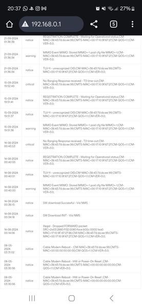 I have my Superhub in Modem mode and have a UniFi setup at home. Speed 1Gb up / 100Mb down. Getting an error every night: "Primary internet is experiencing high latency. Please restart the modem or contact the ISP if this persists." Anyone see any issues in the logs? (obscured the MAC's) Network Log Time Priority Description 11-01-2025 10:52:25 warning RNG-RSP CCAP Commanded Power in Excess of 6 dB Below the Value Corresponding to the Top of the DRW;CM-MAC=7c:16:89:xx:xx:xx;CMTS-MAC=80:e0:1d:xx:xx:xx;CM-QOS=1.1;CM-VER=3.1; 11-01-2025 04:43:02 notice US profile assignment change. US Chan ID: 6; Previous Profile: 12 13; New Profile: 11 13.;CM-MAC=7c:16:89:xx:xx:xx;CMTS-MAC=80:e0:1d:xx:xx:xx;CM-QOS=1.1;CM-VER=3.1; 11-01-2025 04:43:02 warning DBC-REQ Mismatch Between Calculated Value for P1.6hi Compared to CCAP Provided Value;CM-MAC=7c:16:89:xx:xx:xx;CMTS-MAC=80:e0:1d:xx:xx:xx;CM-QOS=1.1;CM-VER=3.1; 11-01-2025 04:32:55 notice US profile assignment change. US Chan ID: 6; Previous Profile: 11 13; New Profile: 12 13.;CM-MAC=7c:16:89:xx:xx:xx;CMTS-MAC=80:e0:1d:xx:xx:xx;CM-QOS=1.1;CM-VER=3.1; 11-01-2025 04:32:55 warning DBC-REQ Mismatch Between Calculated Value for P1.6hi Compared to CCAP Provided Value;CM-MAC=7c:16:89:xx:xx:xx;CMTS-MAC=80:e0:1d:xx:xx:xx;CM-QOS=1.1;CM-VER=3.1; 11-01-2025 02:51:47 notice US profile assignment change. US Chan ID: 6; Previous Profile: 12 13; New Profile: 11 13.;CM-MAC=7c:16:89:xx:xx:xx;CMTS-MAC=80:e0:1d:xx:xx:xx;CM-QOS=1.1;CM-VER=3.1; 11-01-2025 02:51:47 warning DBC-REQ Mismatch Between Calculated Value for P1.6hi Compared to CCAP Provided Value;CM-MAC=7c:16:89:xx:xx:xx;CMTS-MAC=80:e0:1d:xx:xx:xx;CM-QOS=1.1;CM-VER=3.1; 11-01-2025 01:48:23 notice US profile assignment change. US Chan ID: 6; Previous Profile: 11 13; New Profile: 12 13.;CM-MAC=7c:16:89:xx:xx:xx;CMTS-MAC=80:e0:1d:xx:xx:xx;CM-QOS=1.1;CM-VER=3.1; 11-01-2025 01:48:23 warning DBC-REQ Mismatch Between Calculated Value for P1.6hi Compared to CCAP Provided Value;CM-MAC=7c:16:89:xx:xx:xx;CMTS-MAC=80:e0:1d:xx:xx:xx;CM-QOS=1.1;CM-VER=3.1; 10-01-2025 16:32:51 warning RNG-RSP CCAP Commanded Power in Excess of 6 dB Below the Value Corresponding to the Top of the DRW;CM-MAC=7c:16:89:xx:xx:xx;CMTS-MAC=80:e0:1d:xx:xx:xx;CM-QOS=1.1;CM-VER=3.1; 10-01-2025 16:26:39 notice US profile assignment change. US Chan ID: 6; Previous Profile: 12 13; New Profile: 11 13.;CM-MAC=7c:16:89:xx:xx:xx;CMTS-MAC=80:e0:1d:xx:xx:xx;CM-QOS=1.1;CM-VER=3.1; 10-01-2025 16:26:39 warning DBC-REQ Mismatch Between Calculated Value for P1.6hi Compared to CCAP Provided Value;CM-MAC=7c:16:89:xx:xx:xx;CMTS-MAC=80:e0:1d:xx:xx:xx;CM-QOS=1.1;CM-VER=3.1; 10-01-2025 16:22:52 warning RNG-RSP CCAP Commanded Power in Excess of 6 dB Below the Value Corresponding to the Top of the DRW;CM-MAC=7c:16:89:xx:xx:xx;CMTS-MAC=80:e0:1d:xx:xx:xx;CM-QOS=1.1;CM-VER=3.1; 10-01-2025 16:16:36 notice US profile assignment change. US Chan ID: 6; Previous Profile: 11 13; New Profile: 12 13.;CM-MAC=7c:16:89:xx:xx:xx;CMTS-MAC=80:e0:1d:xx:xx:xx;CM-QOS=1.1;CM-VER=3.1; 10-01-2025 16:16:36 warning DBC-REQ Mismatch Between Calculated Value for P1.6hi Compared to CCAP Provided Value;CM-MAC=7c:16:89:xx:xx:xx;CMTS-MAC=80:e0:1d:xx:xx:xx;CM-QOS=1.1;CM-VER=3.1; 10-01-2025 14:56:00 warning RNG-RSP CCAP Commanded Power in Excess of 6 dB Below the Value Corresponding to the Top of the DRW;CM-MAC=7c:16:89:xx:xx:xx;CMTS-MAC=80:e0:1d:xx:xx:xx;CM-QOS=1.1;CM-VER=3.1; 10-01-2025 13:05:08 notice US profile assignment change. US Chan ID: 6; Previous Profile: 12 13; New Profile: 11 13.;CM-MAC=7c:16:89:xx:xx:xx;CMTS-MAC=80:e0:1d:xx:xx:xx;CM-QOS=1.1;CM-VER=3.1; 10-01-2025 13:05:08 warning DBC-REQ Mismatch Between Calculated Value for P1.6hi Compared to CCAP Provided Value;CM-MAC=7c:16:89:xx:xx:xx;CMTS-MAC=80:e0:1d:xx:xx:xx;CM-QOS=1.1;CM-VER=3.1; 10-01-2025 12:55:03 notice US profile assignment change. US Chan ID: 6; Previous Profile: 11 13; New Profile: 12 13.;CM-MAC=7c:16:89:xx:xx:xx;CMTS-MAC=80:e0:1d:xx:xx:xx;CM-QOS=1.1;CM-VER=3.1; 10-01-2025 12:55:03 warning DBC-REQ Mismatch Between Calculated Value for P1.6hi Compared to CCAP Provided Value;CM-MAC=7c:16:89:xx:xx:xx;CMTS-MAC=80:e0:1d:xx:xx:xx;CM-QOS=1.1;CM-VER=3.1; 09-01-2025 20:01:30 warning RNG-RSP CCAP Commanded Power in Excess of 6 dB Below the Value Corresponding to the Top of the DRW;CM-MAC=7c:16:89:xx:xx:xx;CMTS-MAC=80:e0:1d:xx:xx:xx;CM-QOS=1.1;CM-VER=3.1; 09-01-2025 19:56:40 notice US profile assignment change. US Chan ID: 6; Previous Profile: 13; New Profile: 11 13.;CM-MAC=7c:16:89:xx:xx:xx;CMTS-MAC=80:e0:1d:xx:xx:xx;CM-QOS=1.1;CM-VER=3.1; 09-01-2025 19:56:40 warning DBC-REQ Mismatch Between Calculated Value for P1.6hi Compared to CCAP Provided Value;CM-MAC=7c:16:89:xx:xx:xx;CMTS-MAC=80:e0:1d:xx:xx:xx;CM-QOS=1.1;CM-VER=3.1; 09-01-2025 18:58:16 warning RNG-RSP CCAP Commanded Power in Excess of 6 dB Below the Value Corresponding to the Top of the DRW;CM-MAC=7c:16:89:xx:xx:xx;CMTS-MAC=80:e0:1d:xx:xx:xx;CM-QOS=1.1;CM-VER=3.1; 09-01-2025 18:52:31 notice US profile assignment change. US Chan ID: 6; Previous Profile: 12 13; New Profile: 13.;CM-MAC=7c:16:89:xx:xx:xx;CMTS-MAC=80:e0:1d:xx:xx:xx;CM-QOS=1.1;CM-VER=3.1; 09-01-2025 18:52:31 warning DBC-REQ Mismatch Between Calculated Value for P1.6hi Compared to CCAP Provided Value;CM-MAC=7c:16:89:xx:xx:xx;CMTS-MAC=80:e0:1d:xx:xx:xx;CM-QOS=1.1;CM-VER=3.1; 09-01-2025 18:22:20 warning RNG-RSP CCAP Commanded Power in Excess of 6 dB Below the Value Corresponding to the Top of the DRW;CM-MAC=7c:16:89:xx:xx:xx;CMTS-MAC=80:e0:1d:xx:xx:xx;CM-QOS=1.1;CM-VER=3.1; 09-01-2025 18:12:02 notice US profile assignment change. US Chan ID: 6; Previous Profile: 11 13; New Profile: 12 13.;CM-MAC=7c:16:89:xx:xx:xx;CMTS-MAC=80:e0:1d:xx:xx:xx;CM-QOS=1.1;CM-VER=3.1; 09-01-2025 18:12:02 warning DBC-REQ Mismatch Between Calculated Value for P1.6hi Compared to CCAP Provided Value;CM-MAC=7c:16:89:xx:xx:xx;CMTS-MAC=80:e0:1d:xx:xx:xx;CM-QOS=1.1;CM-VER=3.1; 08-01-2025 08:21:56 warning RNG-RSP CCAP Commanded Power in Excess of 6 dB Below the 